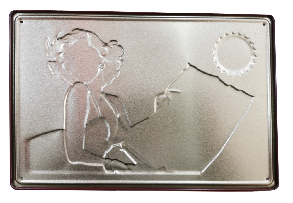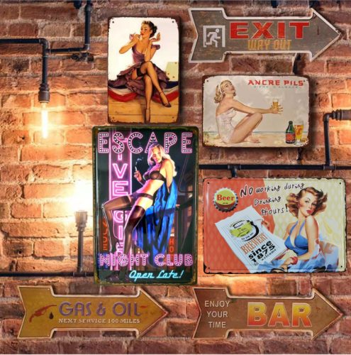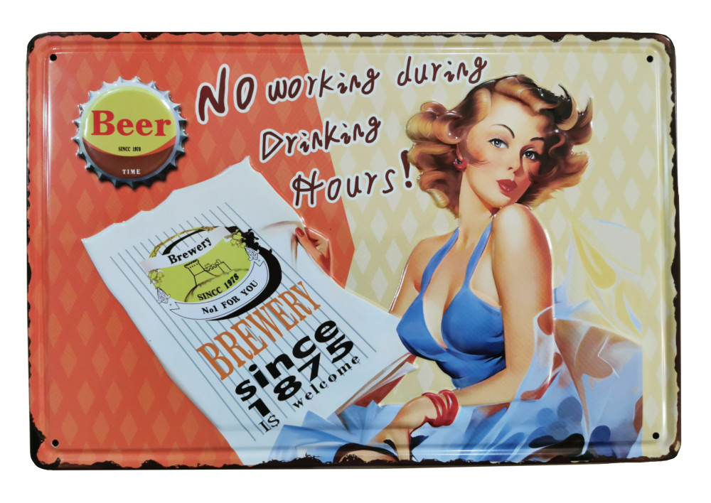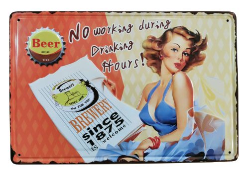 Vintage Dekor Fémtábla, dombornyomott, 'No working during drinking hours!' felirat, retro hangulatú kialakítás, 30x20cm