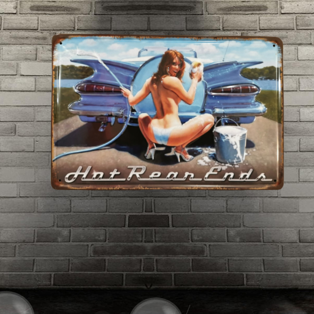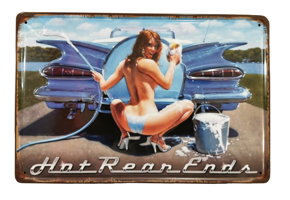 Ez a gyönyörű vintage dombornyomott fémtábla 'Hot Rean Ends' felirattal egy időutazást kínál a múltba, és lenyűgöző módon örökíti meg az autózás szerelmeseinek a világát.
