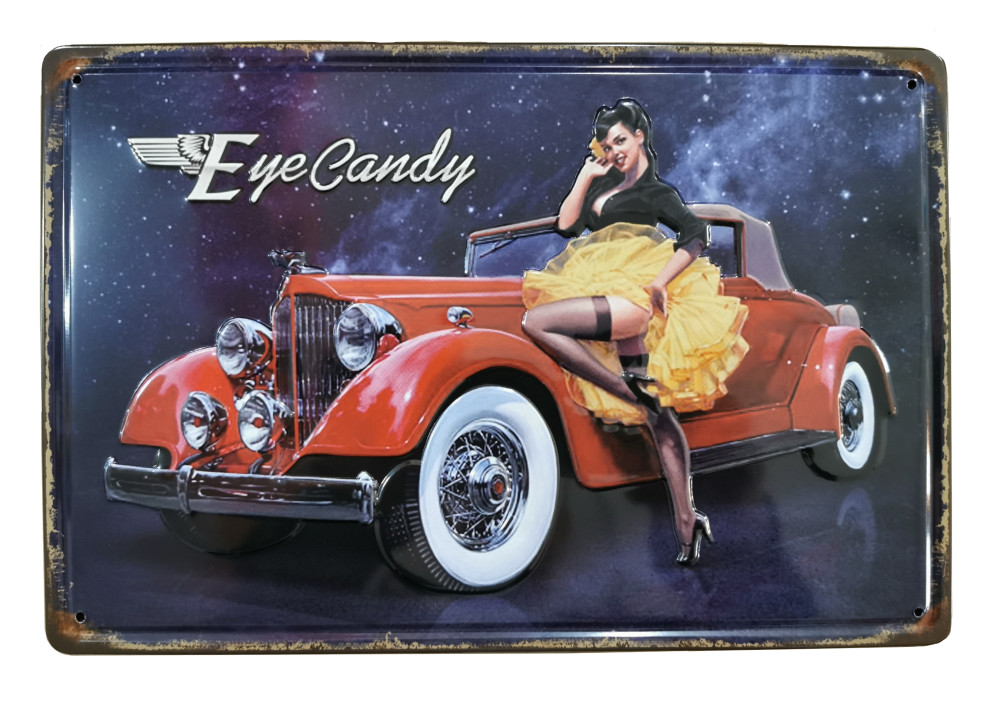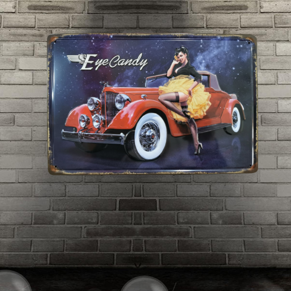 Ez a gyönyörű vintage dombornyomott fémtábla 'Eye Candy' felirattal egy időutazást kínál a múltba, és lenyűgöző módon örökíti meg az autózás szerelmeseinek a világát.