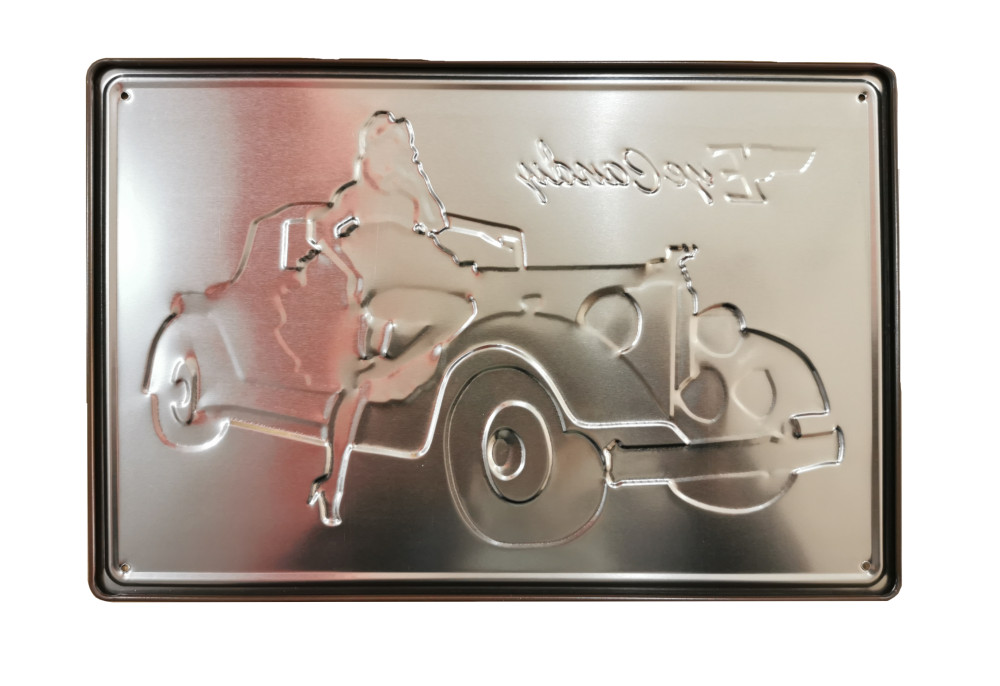 A fémtábla kiváló minőségű, tartós acélból készült, hosszú élettartamot és ellenállóságot garantál. A dombornyomott mintázata élethűen, szemből ábrázol egy csodálatos járművet. Megragadja azoknak a régi időknek a stílusát és varázsát, amikor az autóvezetés még egy egyedi és különleges élmény volt.