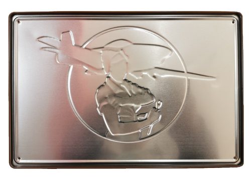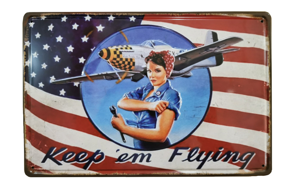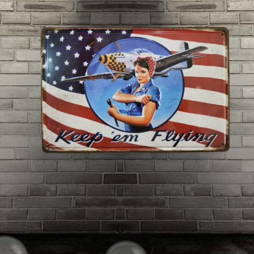 Vintage Dekor Fémtábla, dombornyomott, 'Keep 'em Flying' felirat, retro hangulatú kialakítás, 30x20cm