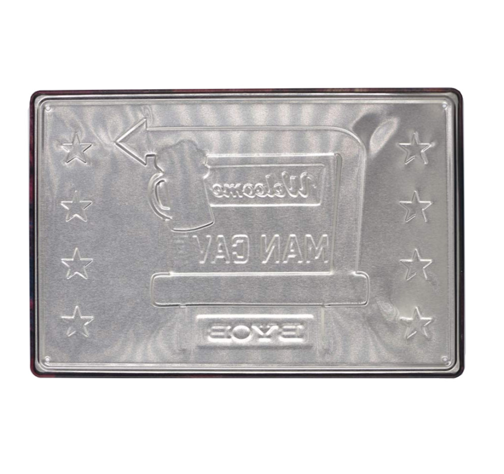 Vintage Dekor Fémtábla, dombornyomott 'MAN Cave' felirat, retro hangulatú kialakítás, 30x20cm, sötétkék-narancssárga háttér