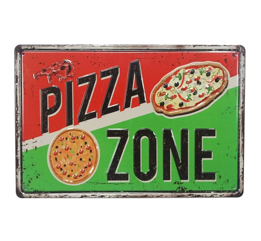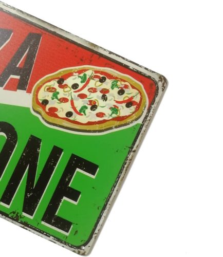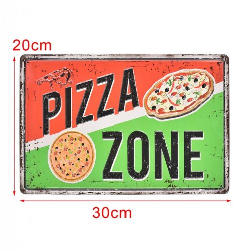 Vintage Dekor Fémtábla, dombornyomott, 'PIZZA ZONE' felirat, retro hangulatú kialakítás, 30x20cm