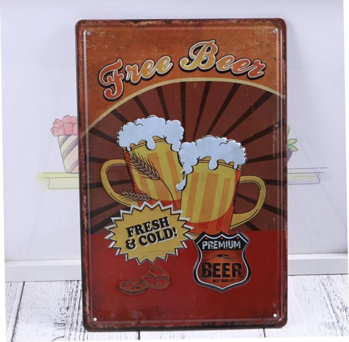Ez a gyönyörű vintage sörös dombornyomott fémtábla egy időutazást kínál a múltba, és lenyűgöző módon örökíti meg az italok világát.