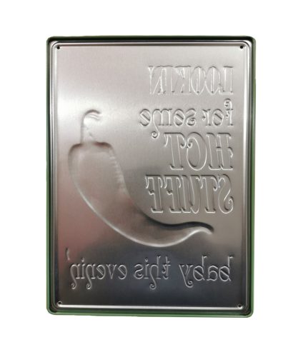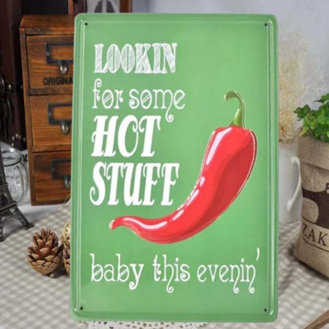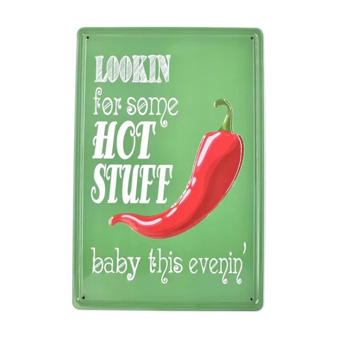 Vintage Dekor Fémtábla, dombornyomott 'LOOKIN for some HOT STUFF' felirat, retro hangulatú kialakítás, 20x30cm