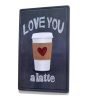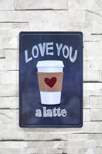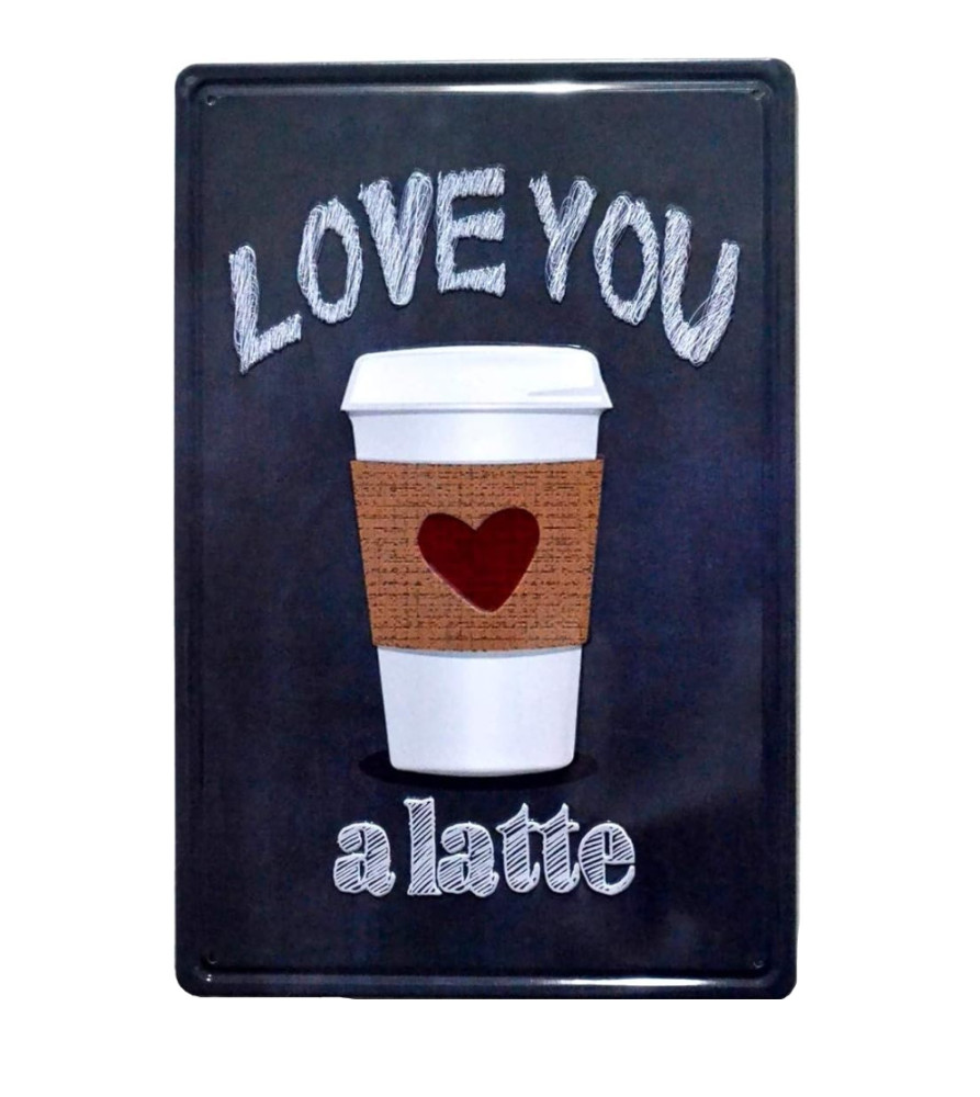 Ez a gyönyörű vintage lattés dombornyomott fémtábla a 'Love you a latte' feliratával lenyűgöző módon örökíti meg a kávé világát.