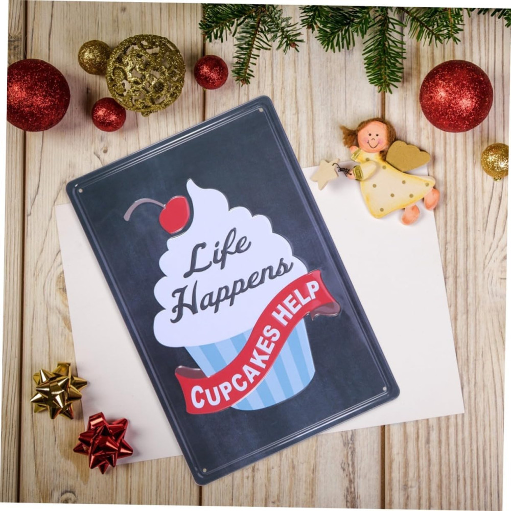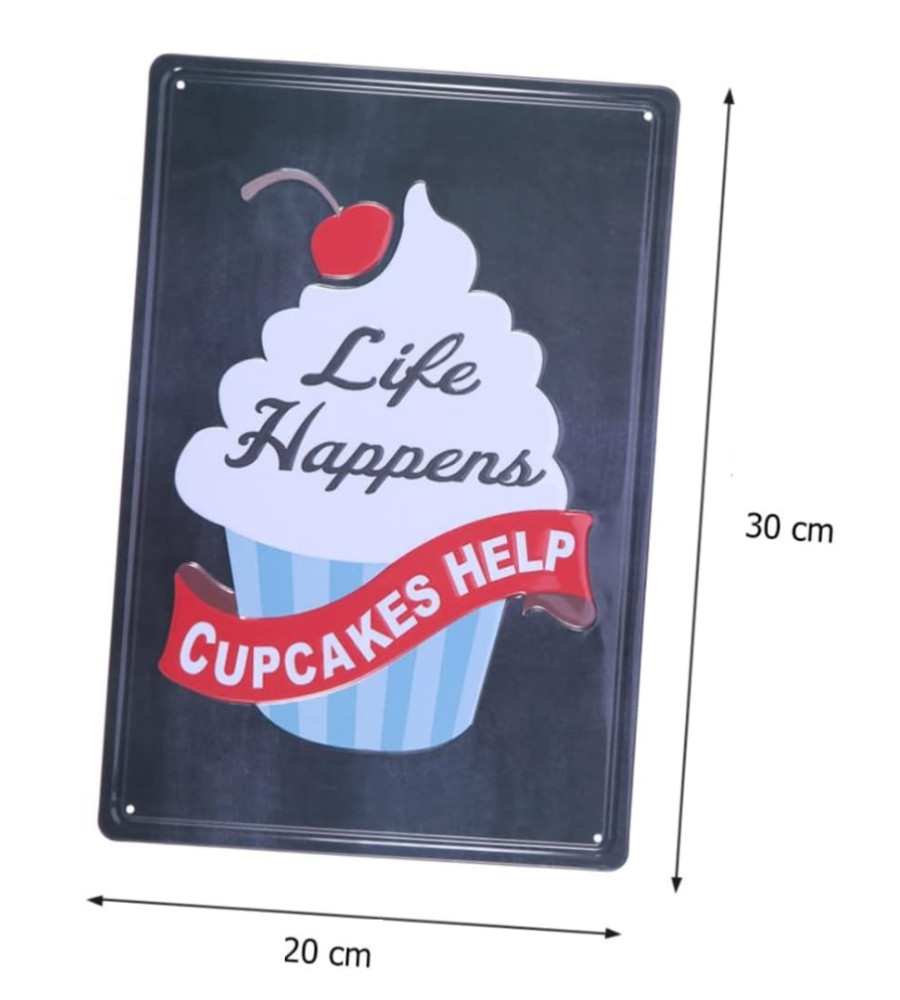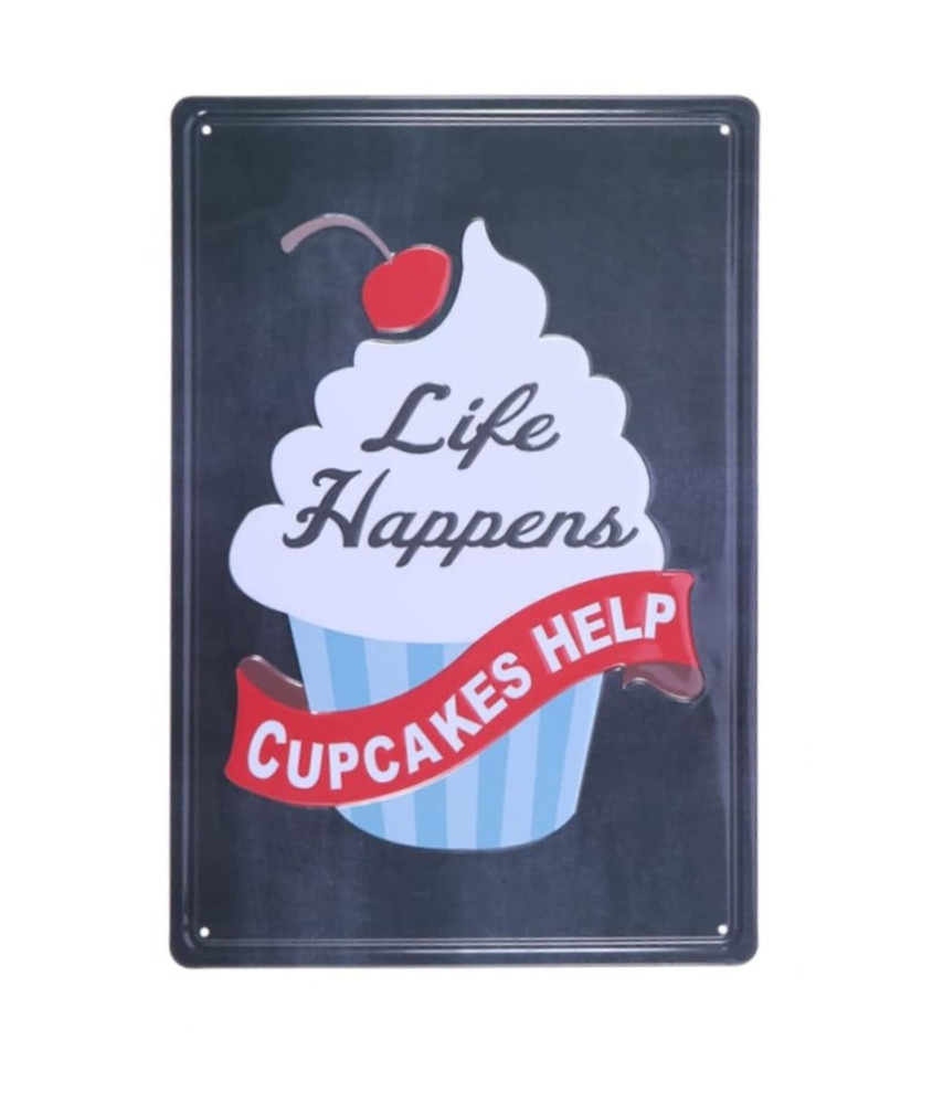 Ez a gyönyörű vintage dombornyomott fémtábla 'Life Happens CUPCAKES HAPPEN' felirattal egy időutazást kínál a múltba és lenyűgöző módon örökíti meg a sütemények világát.