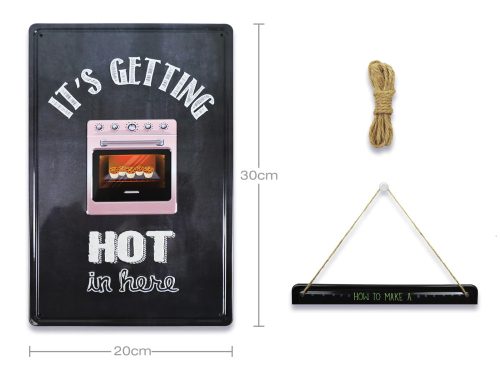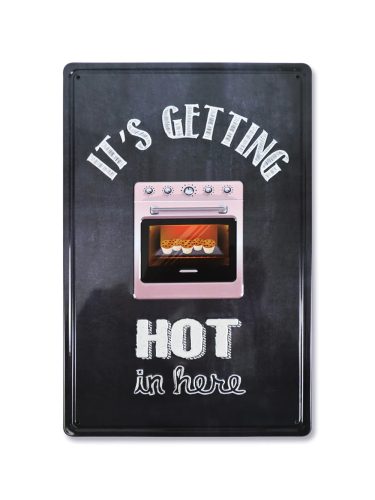 Vintage Dekor Fémtábla, dombornyomott, 'It's getting hot in here' felirat, retro hangulatú kialakítás, 20x30cm