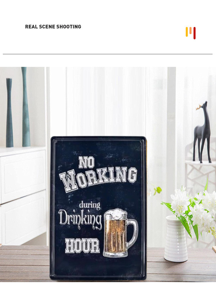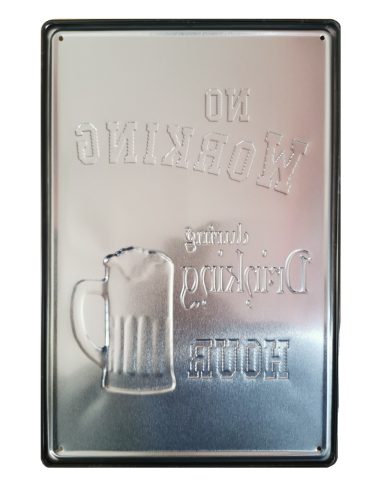 Vintage Dekor Fémtábla, dombornyomott, 'No Working during Drinking HOUR' felirat, retro hangulatú kialakítás, 20x30cm, vintage fekete háttér