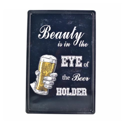 Vintage Dekor Fémtábla, dombornyomott, 'Beauty is in the EYE of the Beer holder' felirat, retro hangulatú kialakítás, 20x30cm, vintage fekete háttér