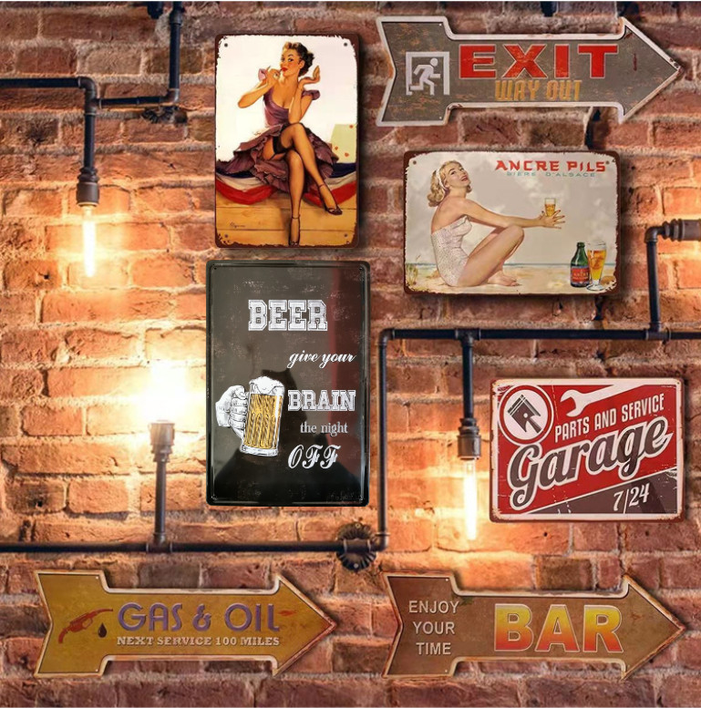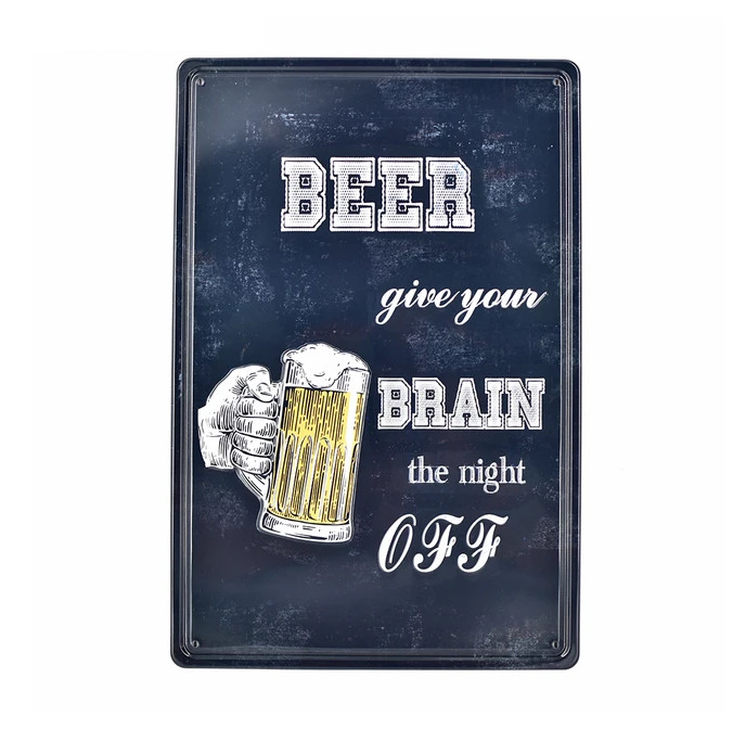 Vintage Dekor Fémtábla, dombornyomott, 'BEER give your BRAIN the night off' felirat, retro hangulatú kialakítás, 20x30cm, vintage fekete háttér