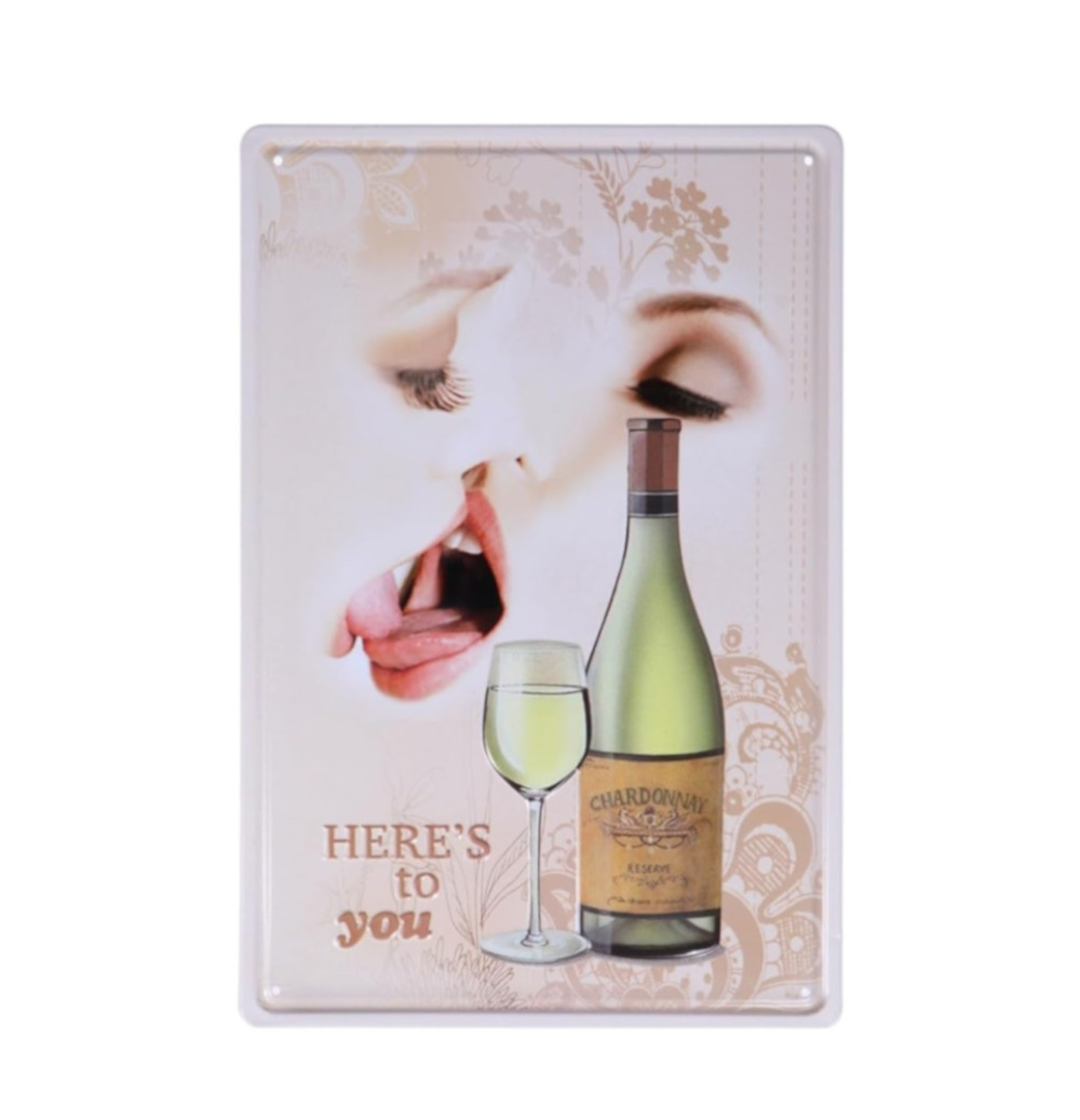 Ez a gyönyörű vintage boros dombornyomott fémtábla egy időutazást kínál a múltba, és lenyűgöző módon örökíti meg a Chardonnay világát.