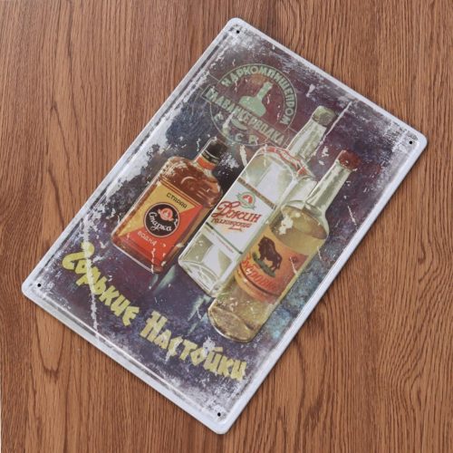 Ez a gyönyörű tömény italokat bemutató vintage dombornyomott fémtábla egy időutazást kínál a múltba, és lenyűgöző módon örökíti meg az italok világát.