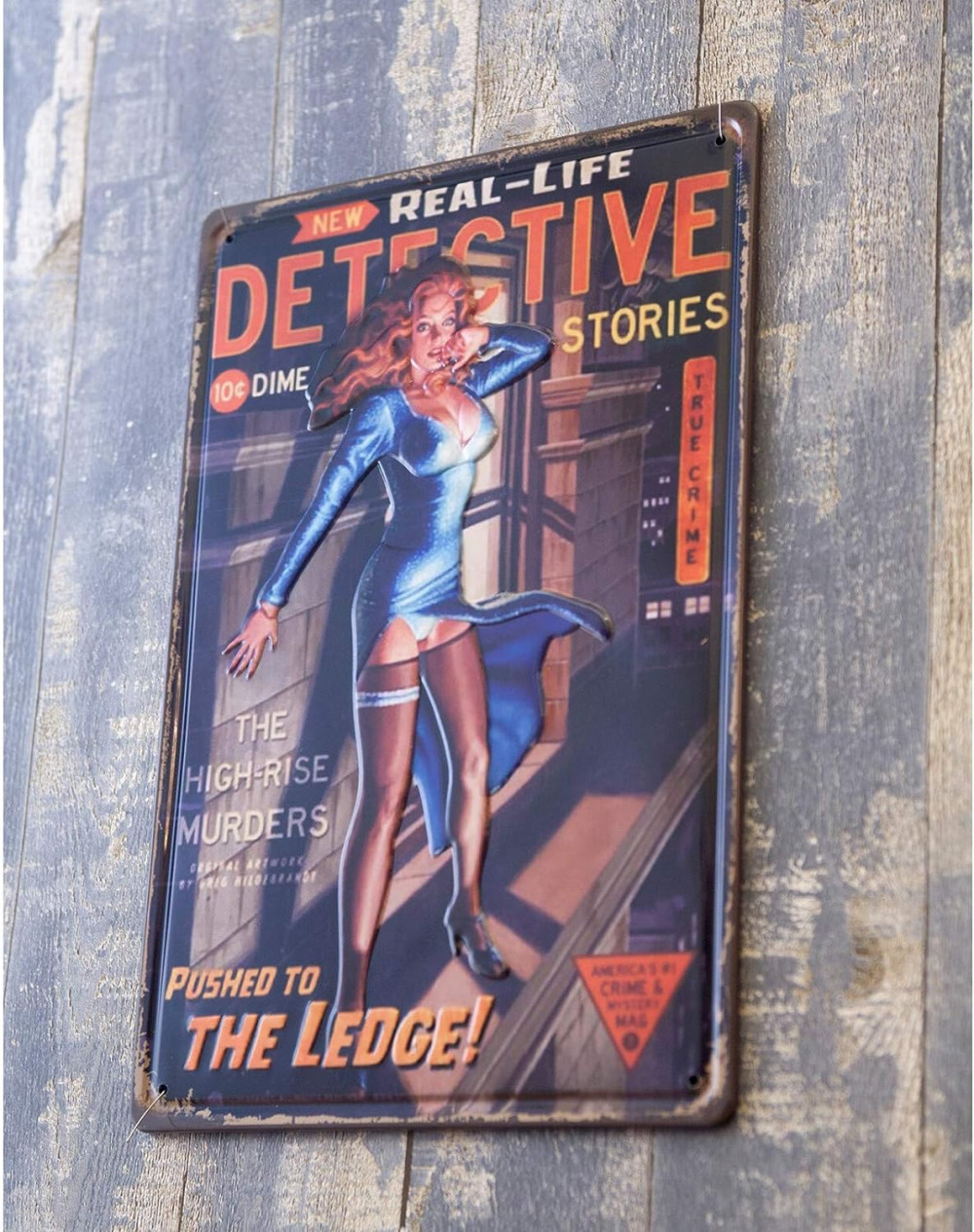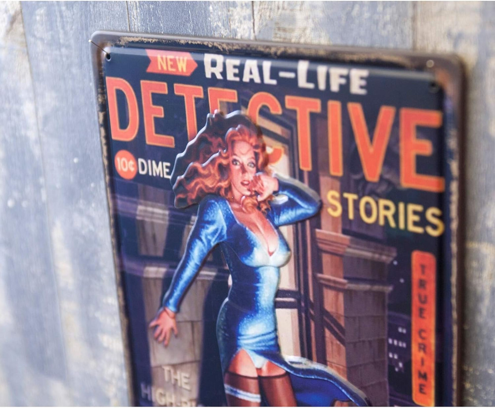 Ez a gyönyörű vintage dombornyomott fémtábla egy időutazást kínál a múltba, és 'Real-Life DETECTIVE stories' feliratával lenyűgöző módon örökíti meg a detective történetet világát.