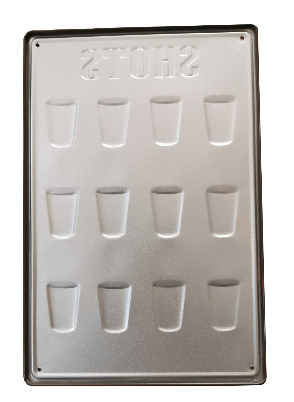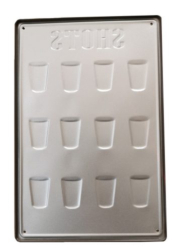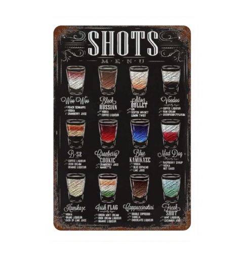 Ez a gyönyörű feleseket bemutató vintage dombornyomott fémtábla a 'SHOTS' feliratával lenyűgöző módon örökíti meg az italok világát.