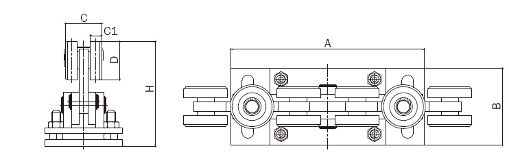 Tíz görgős úszókapu görgősor alaplappal. Ø68mm-es görgőkkel.