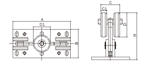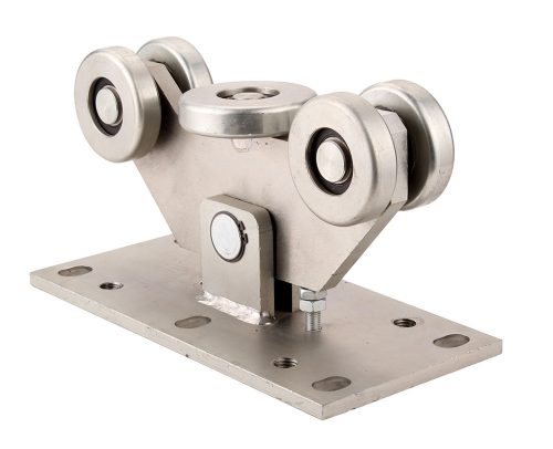 Öt görgős úszókapu görgősor alaplappal. 4db Ø78mm-es és 1db Ø89mm-es görgővel.